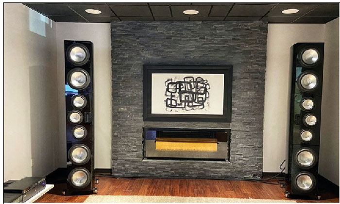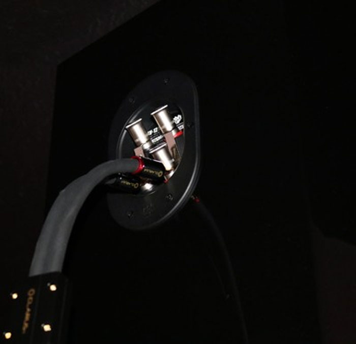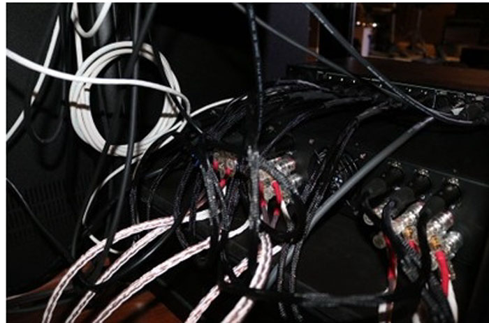 我使用 Kimber 8TC 扬声器线和 Hero XLR 线缆来连接系统。Marani DSP 从你的前置放大器/处理器接收两声道 XLR 输入,并将信号分离用于三路放大,接入 RBH Sound UNRIVALED UA-8 放大器。在 Marani 和 UNRIVALED UA-8 放大器之间为每个声道连接好三根 XLR 线缆后,你就可以进行扬声器线缆的连接了。你首先使用一根 8 英尺长的跳线将顶部和底部的低音模块连接起来,然后再用三根额外的扬声器线缆分别将低音部分连接到 1500 瓦功放,中音部分连接到 500 瓦功放,高音部分连接到 250 瓦功放。