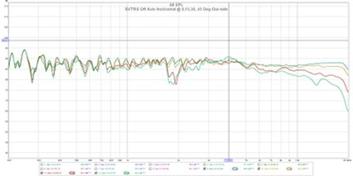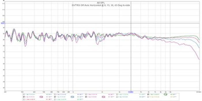 从高音单元起算,从扬声器内侧 0 到 45 度的水平频率响应是平坦且非常均匀的。我原本预期在测量高音单元外侧的水平扩散时,高频滚降会更明显,但令人惊喜的是响应非常相似。这是一个相当宽扩散的扬声器,当你的头部在扬声器之间左右移动时,你不会听到太多的音色变化。垂直扩散在离轴 >30 度时衰减更明显,但这在就座耳平位置不是问题,狭窄的垂直扩散是制造商有意为之的设计特点。这应该使处理天花板反射变得不像处理更传统的三分频扬声器设计那么关键。高音单元的物理高度略高于我的影院座椅的就座耳平位置。我觉得结果它让声像略微偏高了一点。简单地调整脚钉使扬声器略微向下倾斜就在我的房间里解决了这个问题。