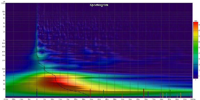 由于采用了主动 FIR 校正以及此 RBH Sound 扬声器系统中缺乏模拟分频器元件,我得以实现完美的脉冲响应,产生了令人难以置信的相位线性度和时间一致性,这是被动扬声器系统无法实现的。正如你在上面的小波图中看到的,两个扬声器同时播放并在主听音位(MLP)测量时,响应从 20kHz 一直到 150Hz 都是完全线性的(黑色垂直虚线),在 150Hz 以下,随着低频频率,延迟略有上升。即使在 20Hz,我们也只看到 20 毫秒的延迟,在这个频率下是听不到的。最终结果是连贯的全频段响应,听起来超级集成且流畅。
